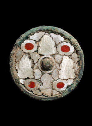 | Inlaid mother-of-pearl bronze mirror back with design of flowers and musicians Tang Dynasty (618-907) |