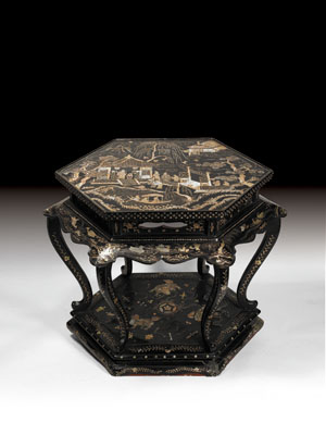 Black lacquer low table with inlaid mother-of-pearl design of figures in landscape Ming Dynasty (1368-1644) |