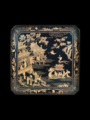 | Black lacquer tray with inlaid mother-of-pearl design of dragon-boat and river scene Ming Dynasty (1368-1644) |