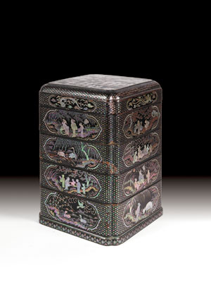 Black lacquer tiered box with inlaid mother-of-pearl design of figures in landscape Ming Dynasty (1368-1644) |