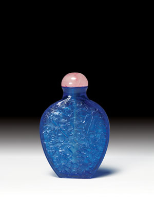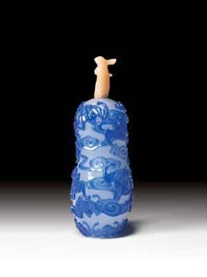 Blue glass snuff bottle with kwai dragon design Qianlong/ Jiaqing (late 18th century) |