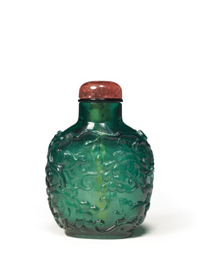 Transparent green glass snuff bottle with squirrels and vine design Qianlong/ Jiaqing (late 18th century) |
