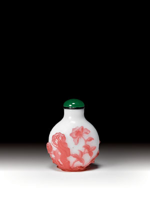 Polychrome overlay pink “snow-storm” glass snuff bottle with peonies design Jiaqing/ Daoguang (early 19th century) |