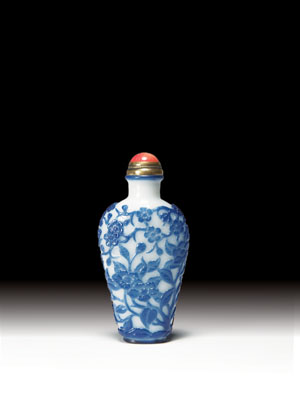 White overlay deep blue glass snuff bottle with flowers and butterfly design Qianlong (1736-1795) |